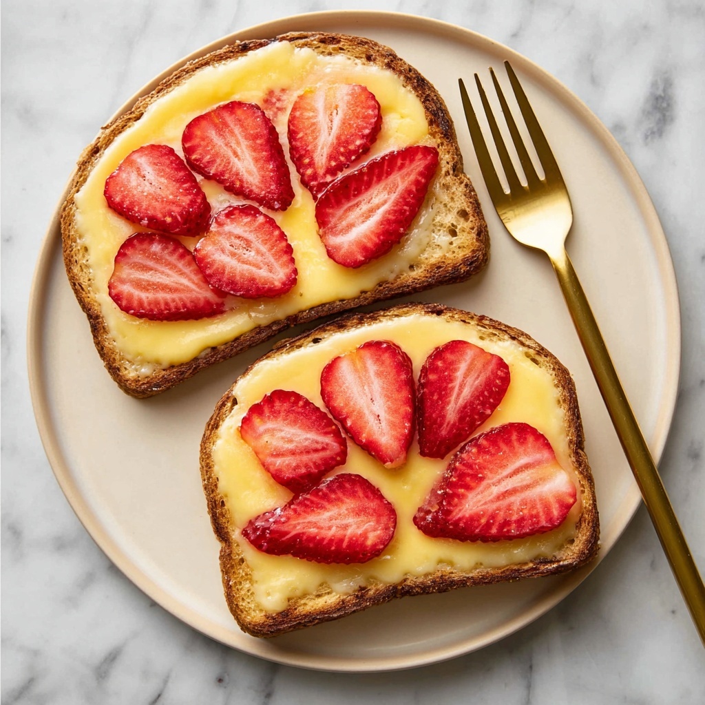 This TikTok Yogurt Toast recipe features a delightful combination of creamy yogurt custard baked atop crusty bread, topped with fresh strawberries and a touch of honey, making for a delicious and nutritious breakfast or snack.
