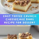 These Toffee Crunch Cheesecake Bars combine a buttery sugar cookie crust with a smooth, creamy cheesecake layer, topped with crunchy crushed toffee bits for a delightful dessert that’s perfect for any occasion.