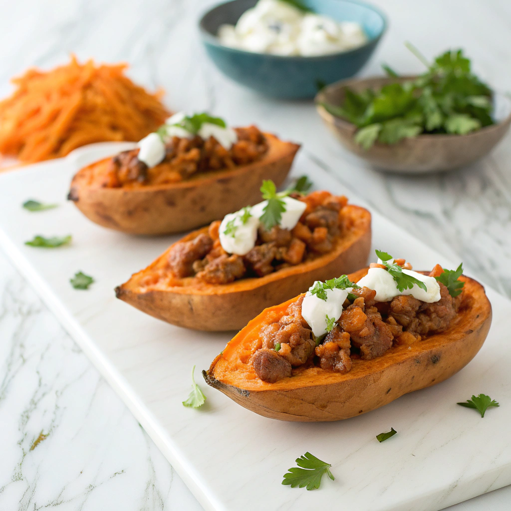 These Turkey Taco Stuffed Sweet Potatoes are a flavorful and healthy twist on traditional tacos. Roasted sweet potatoes are filled with a savory ground turkey taco mixture combined with black beans and corn, then topped with melted cheddar cheese and fresh cilantro. This recipe is perfect for a nutritious weeknight dinner or meal prep and is gluten-free.