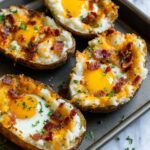 Twice Baked Loaded Breakfast Potatoes are a delicious and comforting breakfast option featuring crispy baked russet potatoes filled with a creamy mixture of mashed potato flesh, sour cream, butter, cheese, bacon, and green onions, then topped with a baked egg for a hearty start to your day.