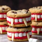 - Assemble the vampire mouth: Gently place the other cookie half on top of the marshmallow-lined half to create a closed mouth with visible “teeth.”