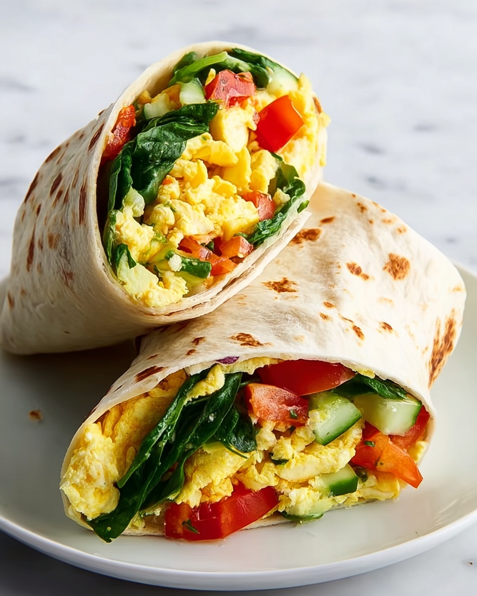 A quick and nutritious Veggie Wrap recipe featuring fluffy scrambled eggs mixed with sautéed bell peppers, onions, and spinach, wrapped in whole wheat tortillas. Perfect for a healthy breakfast or light lunch.
